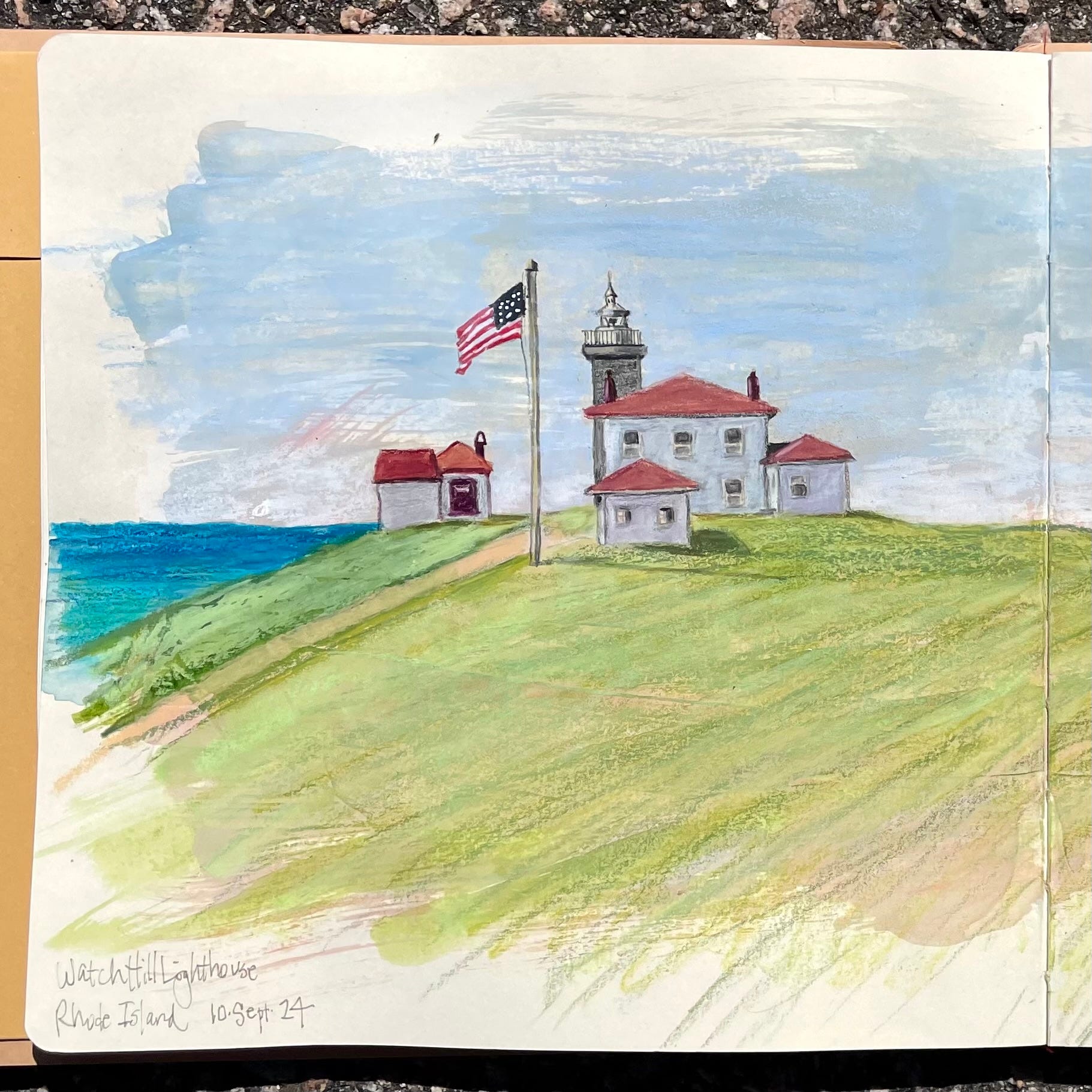 After reconnoitering, I decided to give myself a break regarding linear perspective and chose a simple composition looking out to sea. I had prepared the page beforehand using watered down acrylics so that provided a rough frame for the sketch. I used Neocolor II crayons and colored pencils. It was slow going at first but when I started doing the lawn, I could feel the shift.