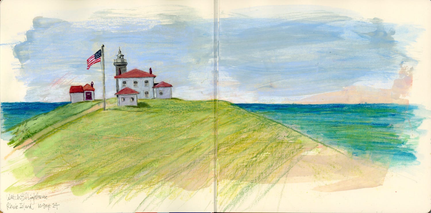 It was a perfect fall day, breezy but not chilly. The day before, we’d visited Beavertail and wind was howling. I had crouched down behind a hedge and tried to draw the lighthouse from a rather severe angle. It was not my most successful work and I left there feeling somewhat down in the dumps.